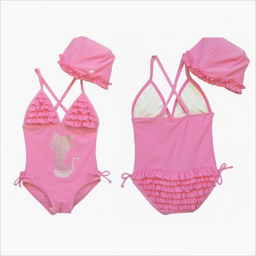 KSWIM-014 90cm/100cm/110cm/120cm/130cm ピンク キャップ付猫ワンピース水着2点セット 子供用水着・子供水着・子供 ...