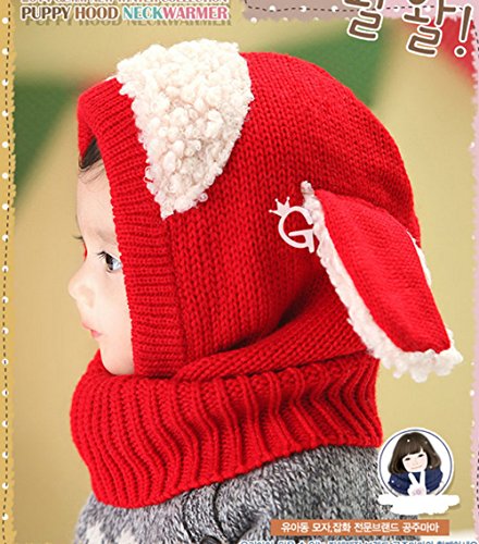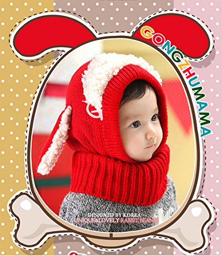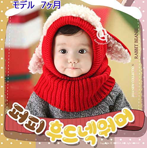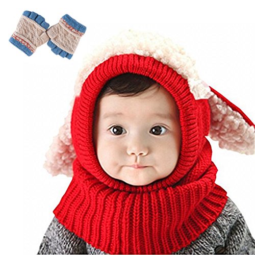 子供 用 ニット帽子 うさぎちゃん風 ニット帽 ベビー キッズ 赤ちゃん かわいい &色ランダム防寒グローブ あたたかい手袋セットとして (レッド)