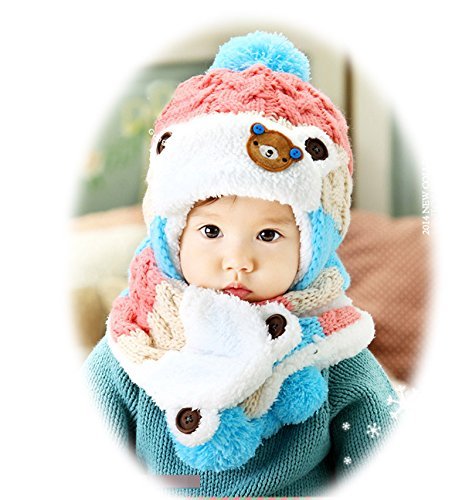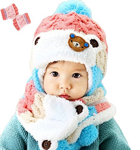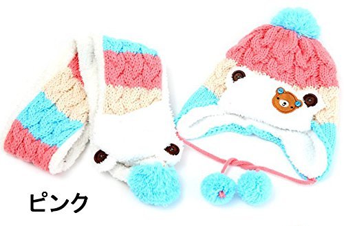 【Yusongirl】赤ちゃん 幼児 子供 服 ギフト 帽子 キャップ かわいい ボンボン 耳あて 耳カバー 付き ボア ニット帽 マフラー セット 男の子 女の子 兼用 防寒 防風 アウター ベビー キッズ (ピンク)