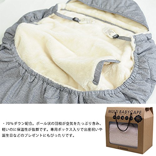 - [特徴]■仕様 ・寒いときはフードをかぶって防寒アップ。フードがずれ落ちにくい専用のクリップ付きなので、移動中も暖かさをキープ。 ・裏表ポケット付きのリバーシブルデザイン。ボア生地は寒い日のお出かけに、撥水加工の記事は雨の日のお出かけに便利。 ・耳やリボンなどの装飾のないシンプルなデザインと、ユニセックスなカラーで、パパも抵抗なく使えます。 ・抱っこ、おんぶ、おくるみ、ベビーカーに、様々なシーンで活躍する使い勝手のいい4WAYケープです。コンパクトにたためるので、持ち運びにも便利です。 ・70%ダウン配合。ボール状の羽枝が空気をたっぷり含み、軽いのに保温性が抜群です。専用ボックス入りで出産祝いや誕生日などのプレゼントにもぴったりです。