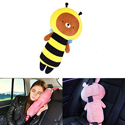 Sunsangシートベルト枕 、カーシートベルトカバー、キッズ 子供 ぬいぐるみおもちゃシートベルトストラップカバー、自動調節可能、子ともの頭、肩、胸を保護 (bee)
