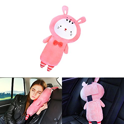 Sunsangシートベルト枕 、カーシートベルトカバー、キッズ 子供 ぬいぐるみおもちゃシートベルトストラップカバー、自動調節可能、子ともの頭、肩、胸を保護 (pink)
