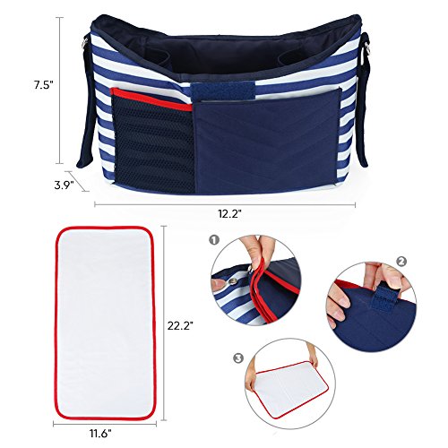 - [収納力抜群] ベビーカーバッグには2つのドリンクホルダーと多数のポケットがあります。すぐに取り出したい小物、哺乳瓶、お菓子、ウェットティッシュ等必需品をきれいに収納でき、整理整頓が楽々です一人でもベビーを連れて買い物ができ、支払いの際でも楽です。