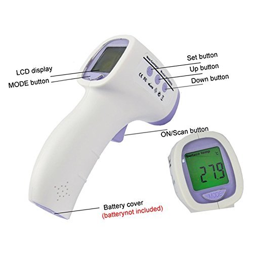 - 非接触赤外線温度計です。 温度計モードだけでなくほ乳瓶の温度など表面温度も測れます 赤外線技術で非接触、安全かつ衛生的です 18秒後に自動で電源Off 0.5秒で測定 電池は単3乾電池2本 3色のバックライト 34℃ ~ 37.3℃緑 37.4℃ ~ 38℃黄色 38.1℃ ~ 42.9℃赤 自動的に50個のデータを保管 仕様: 測定範囲:body 34℃ ~ 42.9℃ surface 0℃ ~ 100℃ 正確さ 0℃ ~ 33.9℃ 0.2℃ 34℃ ~ 34.9℃ 0.3℃ 35℃ ~ 42℃ 0.2℃ 42.1℃ ~ 42.9℃ 0.3℃ 43℃ ~ 100℃ 0.2℃ 測定時間 0.5秒 測定距離 5-15cm 表示 0.1度